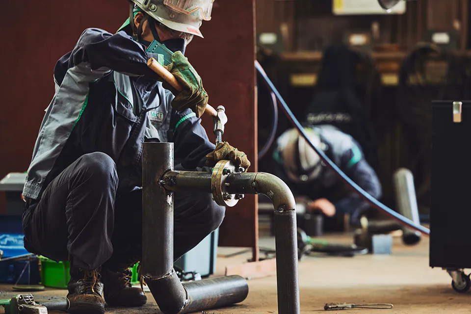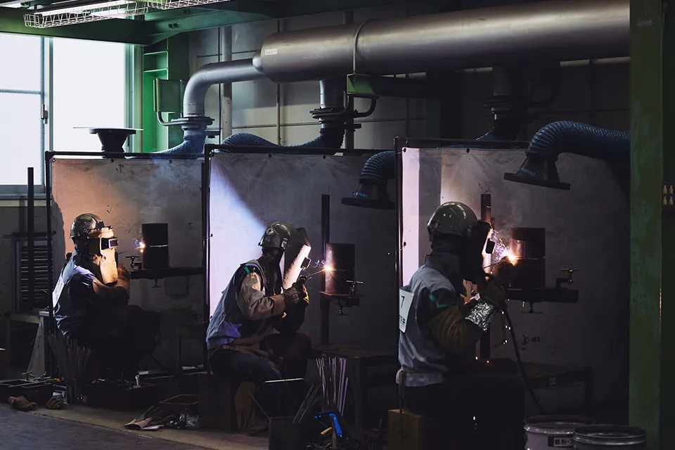 また溶接や仕上げといった技能の継承は重要なテーマです。従来も部署ごと、部門ごとの取り組みによって一定の成果を上げてきましたが、これをさらに大きな取り組みにしていこうと考え、2013年より「社内技術技能競技大会」を実施しています。これは各事業所から推薦を受けた若手の選抜選手たちが「機械組み立て」、「溶接」、「プラント配管」、「とび作業」の4つの種目で技能を競い合うものです。