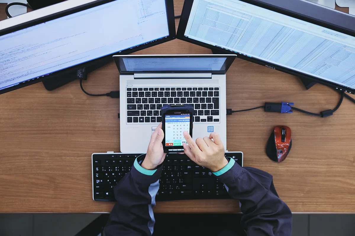 より使いやすい生産設備の実現を目的に、アプリケーション開発にも注力しています。 たとえばハンディターミナルをPC・PLCと通信でつなぎ生産管理を目指すシステムの開発や、ハンディターミナルやタブレットなど手軽な端末で操作・監視などができるアプリケーションの開発などを行っています。